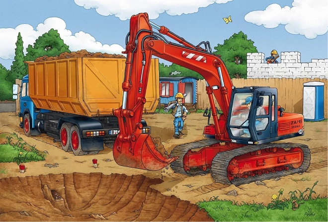 Potopite se v fascinantno gradbiščno okolje s SCHMIDT Puzzle Na gradbišču. Vsaka sestavljanka ima dimenzije 26,3 x 17,8 cm in prikazuje dinamične gradbene scene.