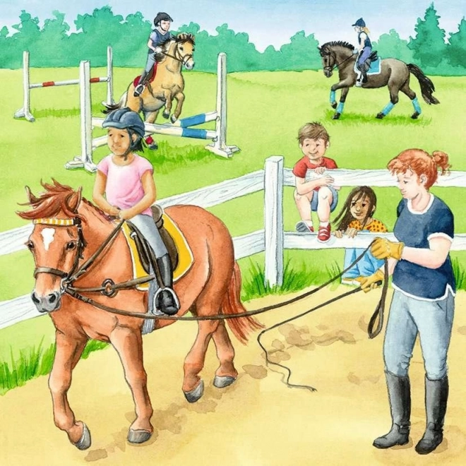 Set treh sestavljank RAVENSBURGER Dan pri konjih ponuja otrokom različne prizore iz jahalnega okolja – od nege v hlevu do radosti ježe v naravi. Vsaka sestavljanka ima 49 koščkov, ki se odlično prilegajo in so prijetni na dotik. Zahvaljujoč kakovostnemu tisku in trpežnemu kartonu jih je mogoče sestavljati znova in znova.