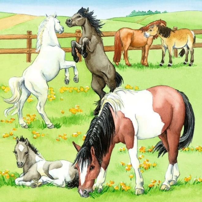 Idiličen prizor s konji na zeleni jasi bo razveselil ljubitelje živali ter spodbudil zaznavanje barv in detajlov. Odlično za mirno popoldansko sestavljanje.