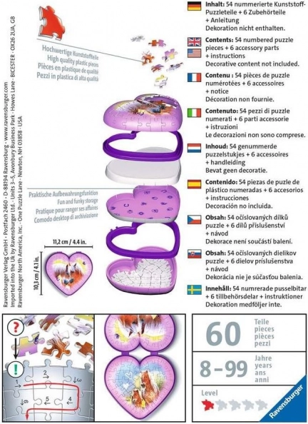Odkrijte čar 3D sestavljanke RAVENSBURGER: iz natančno izdelanih, ukrivljenih in prožnih kosov sestavite impresivno škatlico za nakit v obliki srca z nežnim motivom konj. Konstrukcija je stabilna, trdno drži brez lepila in po sestavljanju služi kot funkcionalna ter lepa dekoracija otroške sobe.