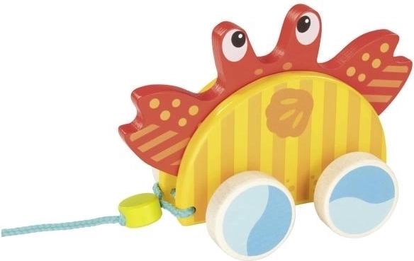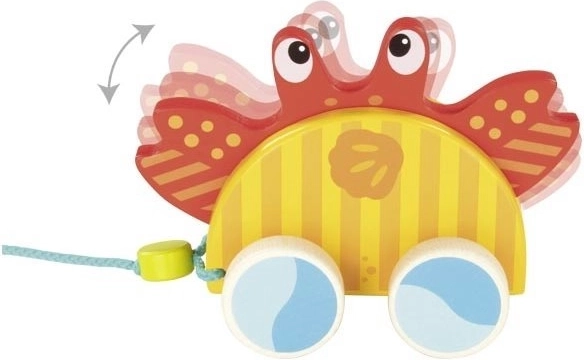 Ta barvita vlečna igrača v obliki raka je izdelana iz kakovostnega masivnega lesa, kar zagotavlja dolgo življenjsko dobo in varnost za otroke. Kolesca igrače spominjajo na morske valove, kar jo dela igrivo in opazno popestritev otroške sobe.