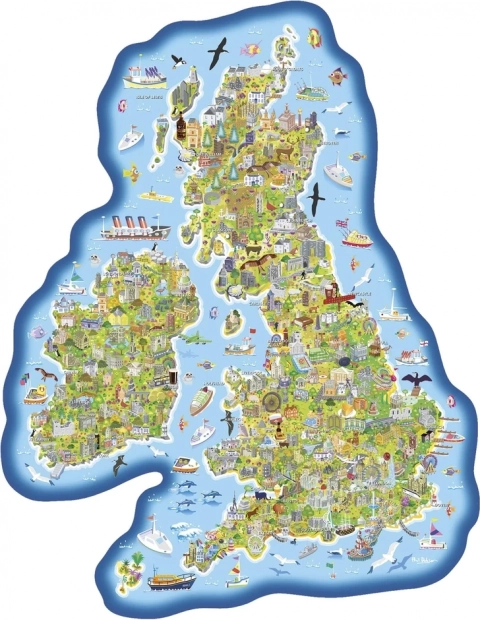 Obrisne puzzle Zemljevid Velike Britanije in Irske ponujajo bogato ilustriran pogled na značilne živali, znamenitosti in zanimivosti posameznih območij Britanskih otokov. Idealno za podporo učenju in izboljšanje geografskega znanja.