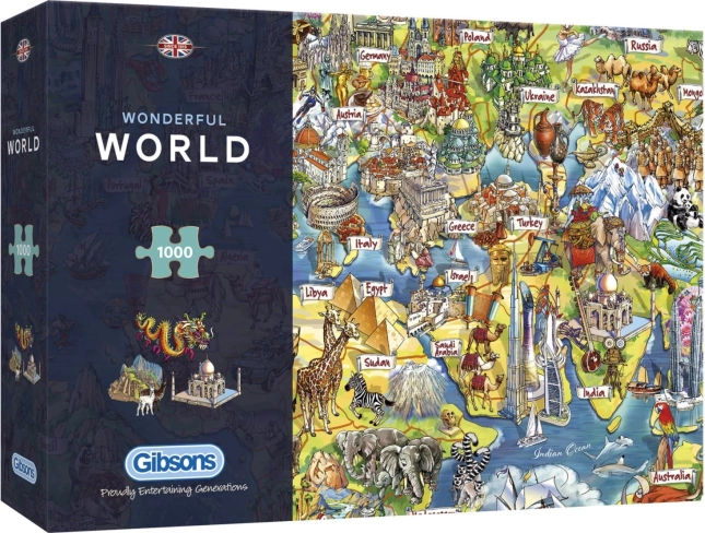 Potopite se v fascinanten svet risanih celin in držav s sestavljanko Gibsons Čudoviti svet. To privlačno sestavljanko je ustvarila nadarjena Marie Rabinky in prinaša kar 1000 koščkov za sestavljanje. Edinstvene podrobnosti in živahne barve zagotavljajo ure zabave za vso družino.