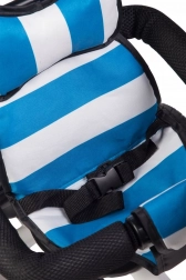 Varnostni pasovi držijo otroka v pravilnem položaju na sedežu, posebni ščitnik med nogami pa preprečuje zdrs. Če otrok ne doseže pedal, lahko noge nasloni na preklopne opore za noge, ki jih je mogoče zložiti, da ne ovirajo pri poganjanju.