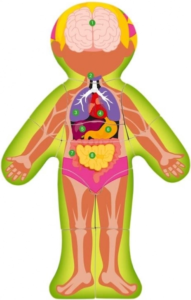 Kakovostne lesene puzzle razvijajo otrokovo domišljijo, fino motoriko in logično mišljenje. Otrok sestavlja dvanajst koščkov s podobo deklice, na njihovem hrbtni strani pa so označeni človeški organi. Podlaga prikazuje človeško okostje in vsebuje oštevilčen seznam organov in kosti – odličen uvod v spoznavanje anatomije v angleščini.