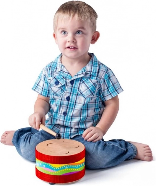 Igra na bobenček spodbuja naravni razvoj ritmičnega občutka, fine motorike in zbranosti. Del pakiranja je lesena palčka, s katero lahko otroci varno preizkušajo prve ritme in pesmice.