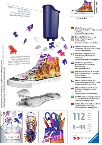 Koščki so izdelani iz trde plastike za vrhunsko stabilnost, sestavljena superga pa ostane skupaj brez lepljenja. Ta 3D sestavljanka je ne le zabaven izziv, temveč tudi praktičen dekorativni predmet.