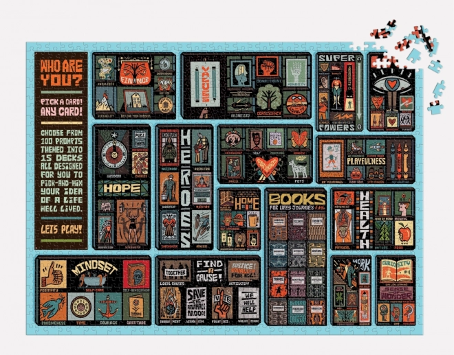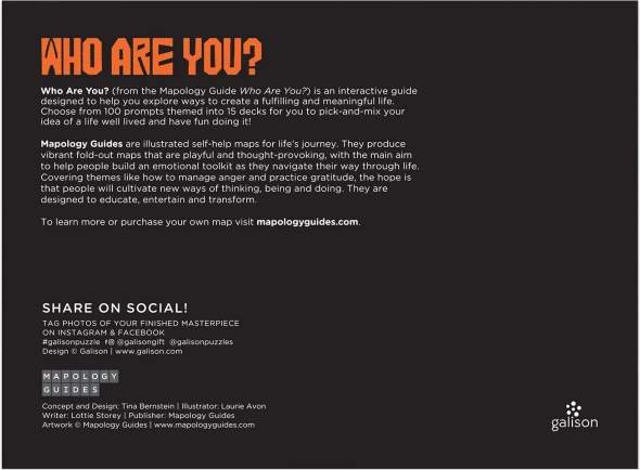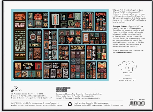 Potopite se v ustvarjalni počitek z dizajnersko sestavljanko, ki iz običajnega sestavljanja naredi smiselno izkušnjo. Motiv »Who Are You?« sestavlja navdihujoča mreža ilustracij in izrekov iz Mapology Guides – nežno vas vodi k razmisleku, samoodkrivanju in pozitivnemu razpoloženju.