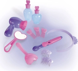 Toaletna mizica, stolček, 12 kosov dodatkov (stekleničke, sušilec za lase, naglavni obroč, sponke ipd.)