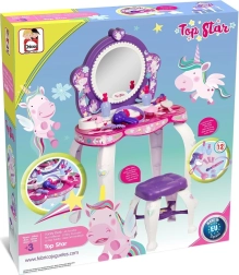 Spremenite otroško sobo v mali kozmetični studio. Toaletna mizica CHICOS Top Star z motiveom samorogov bo navdušila svoje male lastnice z barvito izvedbo in praktičnimi dodatki. Priloženi so stolček in komplet 12 kosov dodatkov, kot so stekleničke, sušilec za lase, naglavni obroč in sponke, ki spodbujajo domiselno igro.