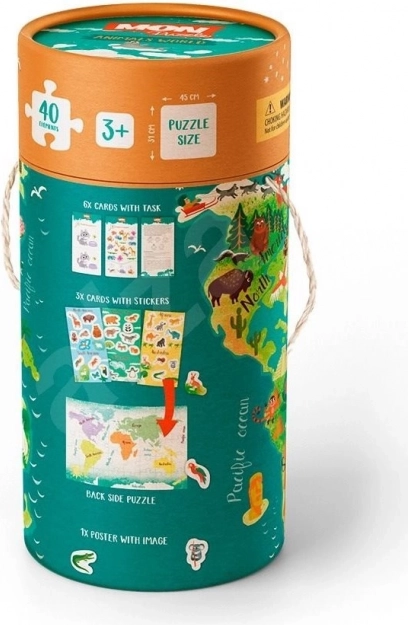 Odkrijte igriv komplet za otroke od 3 let, ki združuje dvostranske sestavljanke s 40 koščki, kartice z nalogami, plakat in nalepke. Darilni tulec skriva ure zabave ter hkrati razvija fino motoriko, logično razmišljanje in spoznavanje živali z vsega sveta.