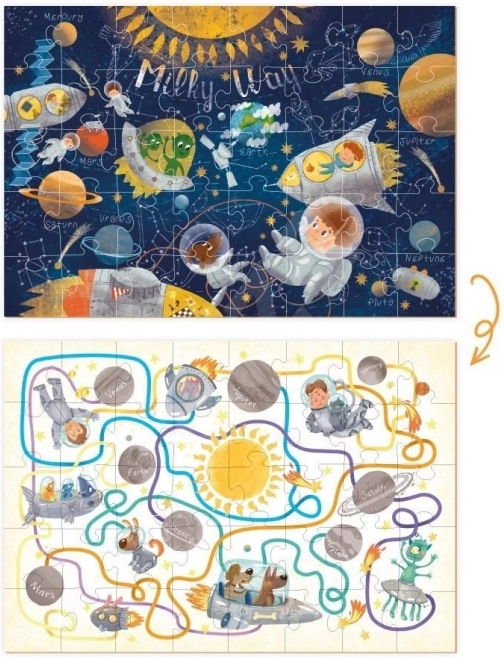 Ta igrivi komplet povezuje sestavljanje obojestranske sestavljanke z zabavnimi aktivnostmi, ki otroke popeljejo v temo vesolja. S pisanim ilustracijami in premišljeno zasnovanimi nalogami podpira neprekinjeno učenje skozi igro in krepi sposobnost zbranosti.