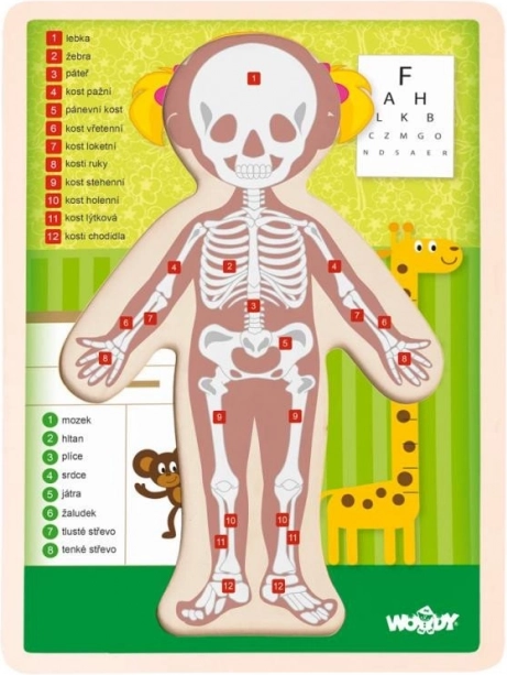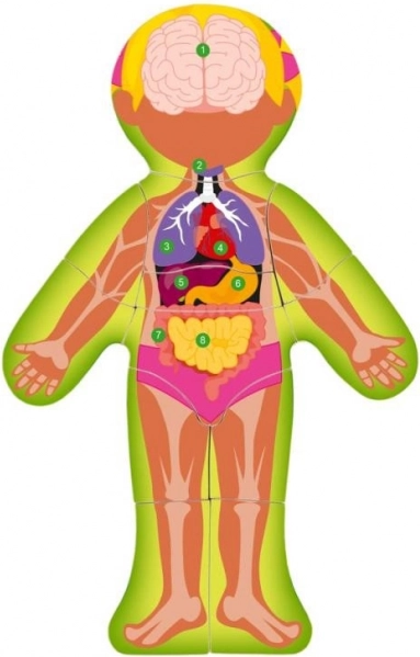 Ta obojestranska sestavljanka ponuja edinstven pogled na človeško telo skozi dekliško postavo z dvanajstimi deli. Na eni strani so prikazani človeški organi, medtem ko druga prikazuje zgradbo človeškega okostja. Zlaganje te sestavljanke bo otroku pomagalo bolje razumeti, kako človeško telo deluje: