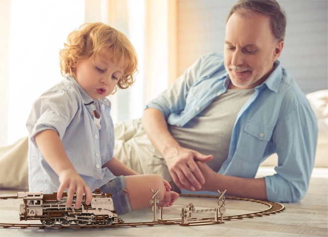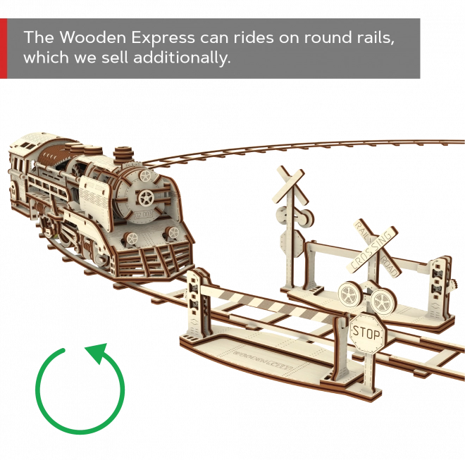 Priložen je kratek odsek proge, na katerem lahko model predstavite. Natančni laserski izrezi iz brezove vezane plošče zagotavljajo gladko sestavljanje brez lepila.