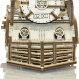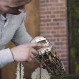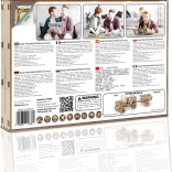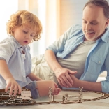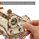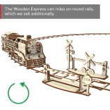 Doživite veselje ob natančnem delu z lesom in opazujte, kako se vaša parna lokomotiva spremeni v živ mehanski model. WOODEN CITY Wooden Express je podrobna 3D sestavljanka iz kakovostne brezove vezane plošče, ki se sestavi brez lepila in orodja. Po sestavi jo postavite na priložene tire in zahvaljujoč gumijastemu pogonu se zapelje naprej, nazaj in po krogu.