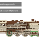 Lokomotiva uporablja gumimotor in zobnike, zato se po navijanju resnično pelje naprej in nazaj. Prenose in bate boste videli neposredno v akciji.