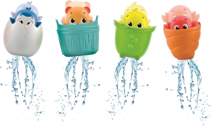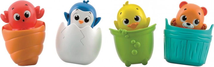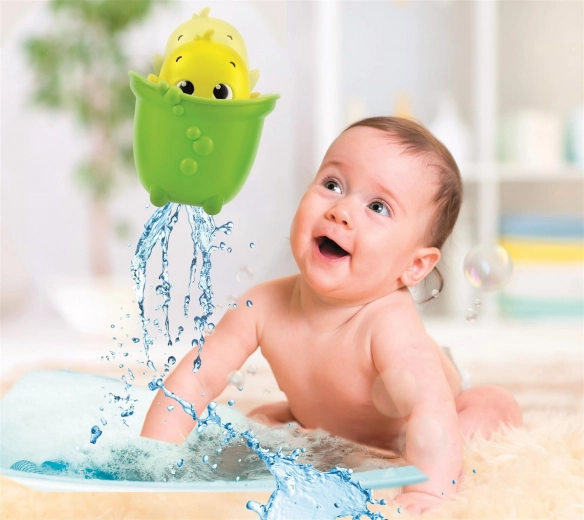 Potopite igračo in opazujte, kako živalca pokuka. Ko jo dvignete, voda odteče skozi odprtine in račka se spet skrije – neskončna zabava pri vsakem kopanju.