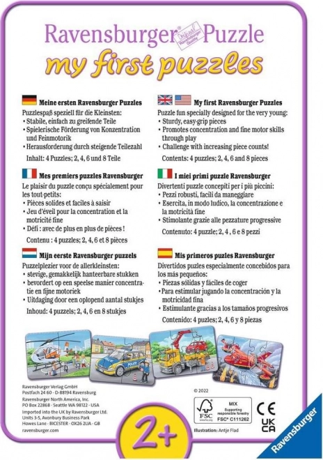 Odkrijte prve korake v svetu sestavljank z Ravensburgerjevim setom za najmlajše. Štiri podobe interventnih vozil z naraščajočim številom koščkov: 2, 4, 6 in 8 razvijajo fino motoriko, zbranost in domišljijo. Izjemno trden karton in robustni koščki olajšajo rokovanje in prenesejo otroške ročice. Idealno od 2. leta dalje.