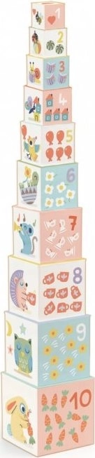 Ta komplet vsebuje 10 kock, ki jih je mogoče sestaviti eno na drugo do višine 89 cm. Največja kocka ima mere 15 x 15 x 15 cm.