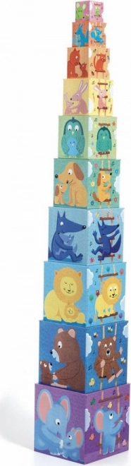 Priljubljeni škatlasti stolp znamke DJECO z ilustracijami mamic in njihovih mladičev. Otroci bodo uživali v zlaganju v višino do 89 cm, podiranju in vstavljanju kock ena v drugo, pri čemer se naravno učijo barv, oblik in prvih računskih pojmov ter razvijajo fino motoriko. Komplet vsebuje 10 kock za ure zabave.
