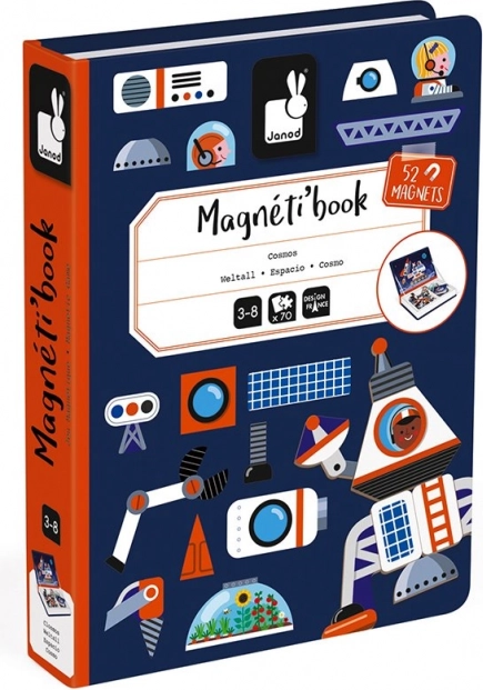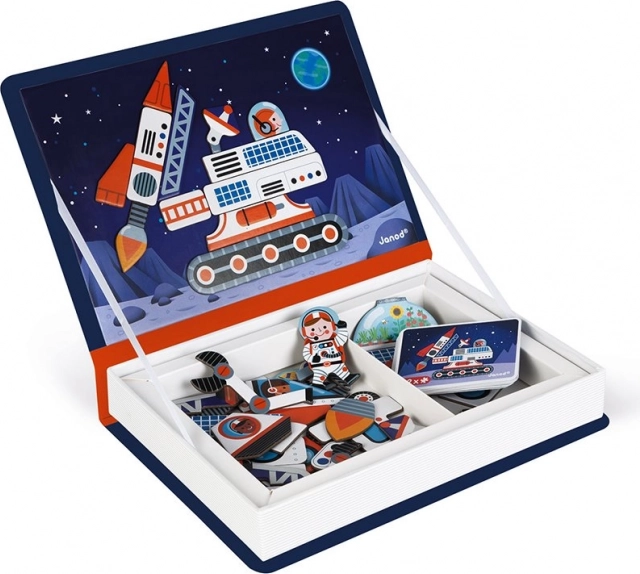 Odkrijte pametno igračo, ki razvija domišljijo in fino motoriko: Magnetibook Vesolje podjetja Janod. Otroci sestavljajo vesoljska vozila iz magnetnih delov po karticah ali lastni domišljiji. 52 magnetnih delov, 18 predlog, kakovostna izdelava in praktična knjižna embalaža, idealna za na pot. Primerno za otroke 3–8 let.