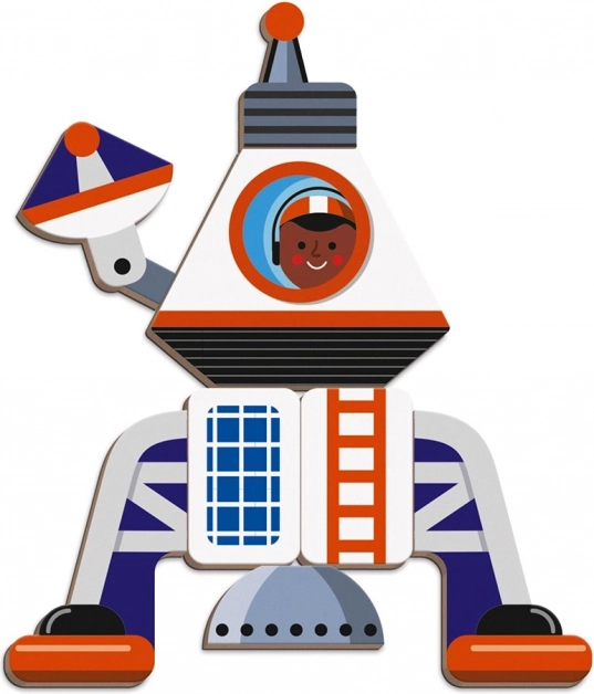 V paketu najdete 52 magnetnih delov in 18 kartic s predlogami vesoljskih vozil. Otroci lahko sestavljajo po karticah ali ustvarjajo lastne kombinacije. Magnetke lahko uporabite tudi na drugih magnetnih tablah ali površinah.
