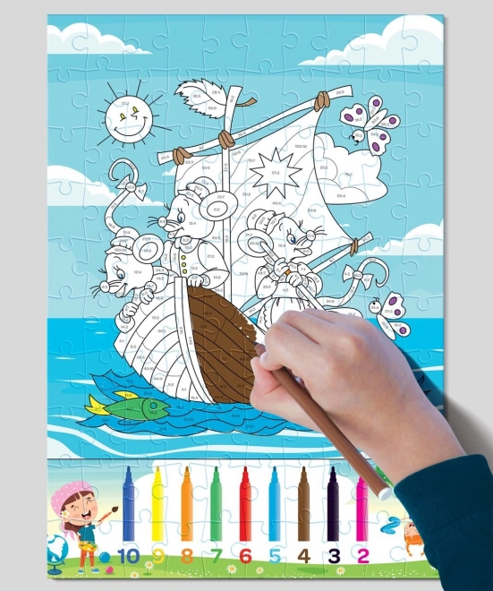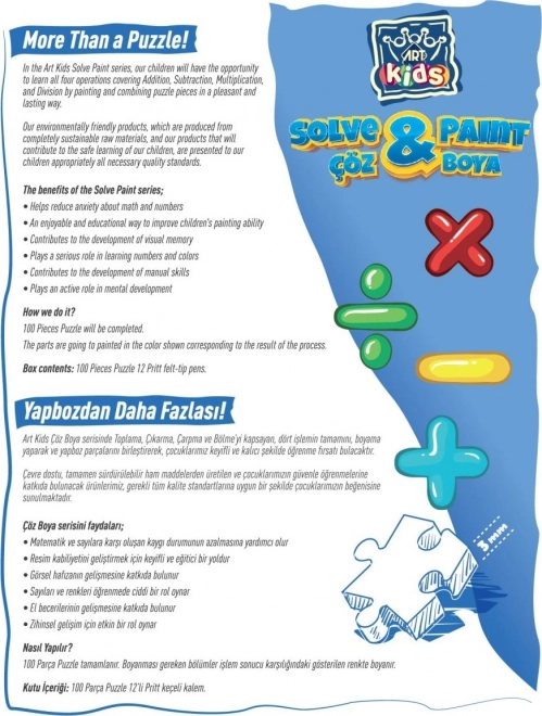 Sestavljanka se osredotoča na učenje osnovnih matematičnih principov, kot so seštevanje, odštevanje, množenje in delitev, kar prispeva k razvoju matematičnih sposobnosti brez nepotrebne zaskrbljenosti. Z barvanjem in sestavljanjem puzzle se otroci lahko izboljšajo v ročni spretnosti in pridobijo večji vizualni spomin.