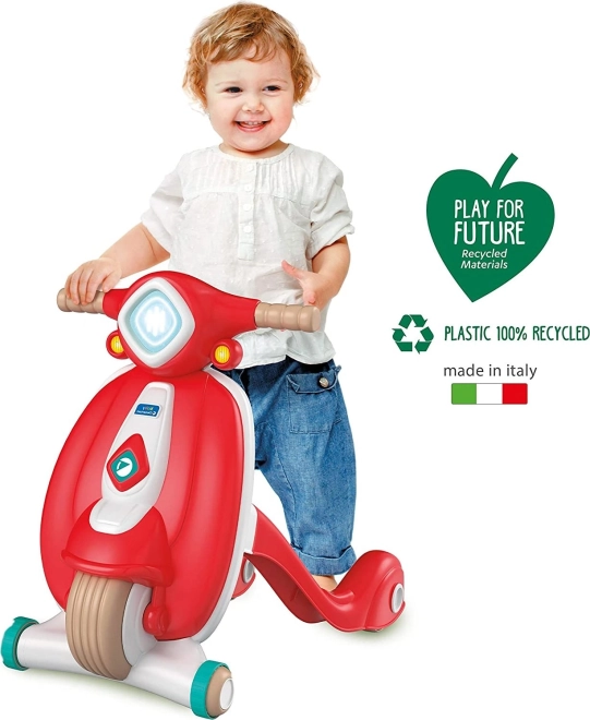 Slogovna otroška hodulja in poganjalec, navdihnjena z ikonično znamko Vespa, pomaga otrokom pri prvih korakih in vadbi ravnotežja. Ima ergonomsko zasnovo, stabilno konstrukcijo in praktičen shranjevalni prostor za drobne igrače. Izdelano iz 100 % reciklirane plastike, prijazno do narave in idealno za otroke od 10 do 36 mesecev.