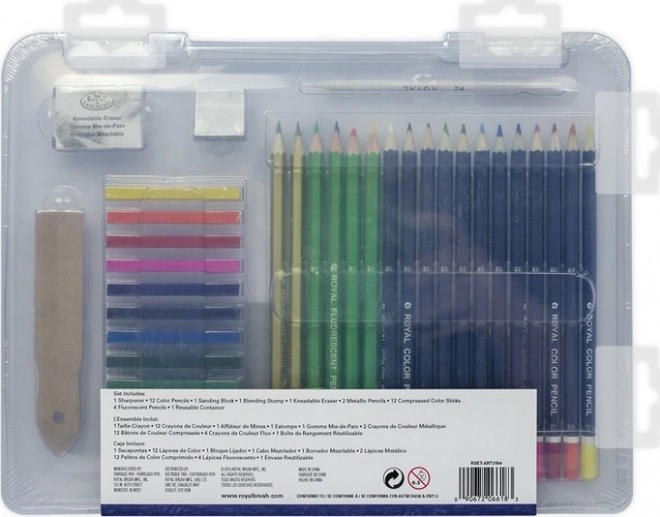 Univerzalni 35-delni risarski komplet v praktičnem plastičnem kovčku znamke ROYAL & LANGNICKEL za začetnike in napredne. Vsebuje akvarelne barvice, barvne ogljene svinčnike, fluorescenčne in kovinske svinčnike ter tudi nujne pripomočke za udobno risanje doma in na poti.