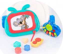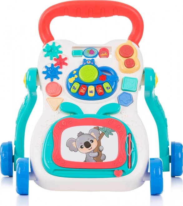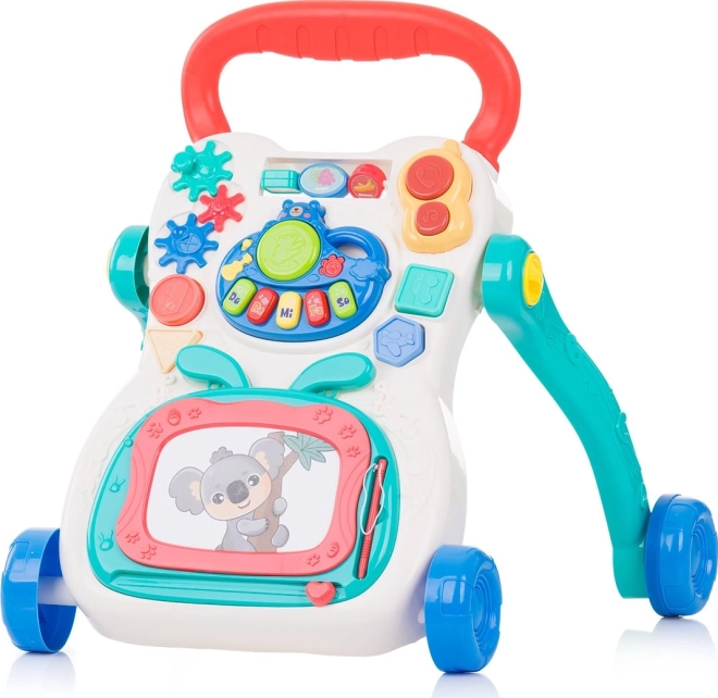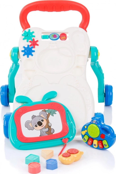 Interaktivna potisna hodulja je idealen spremljevalec za otroke, ki že samostojno hodijo in želijo odkrivati nove veščine. Zahvaljujoč širokemu ročaju in stabilnim kolesom pomaga izboljševati samozavest pri hoji, medtem ko igralna plošča z ljubkim motivom koale ponuja veliko zabave – od melodij in svetlobnih efektov do risanja in igranja na tipkah.
