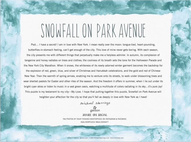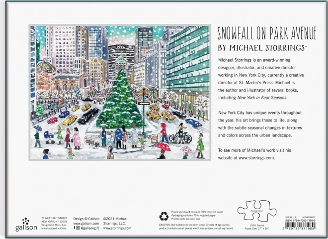 Uživajte v čarobnem vzdušju zimskega New Yorka s sestavljanko Sneženje na Park Avenue avtorja Michaela Storringsa, ki vsebuje 1000 kosov. Idealna zabava za dolge zimske večere, ki ne le razvija vašo logiko, ampak prinaša tudi veselje trajnostno izdelanega izdelka.