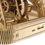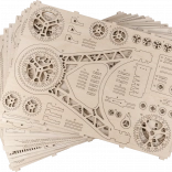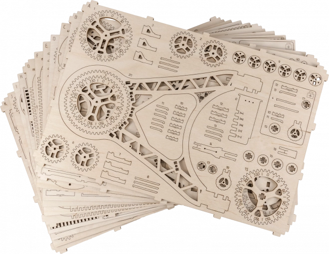 Sestavljanje traja približno 8 ur in zahteva osnovna orodja, kot so lomljiv nož, škarje, brusni papir in voščena sveča. Doživite ure zabave pri sestavljanju in odkrivanju mehanskih načel.