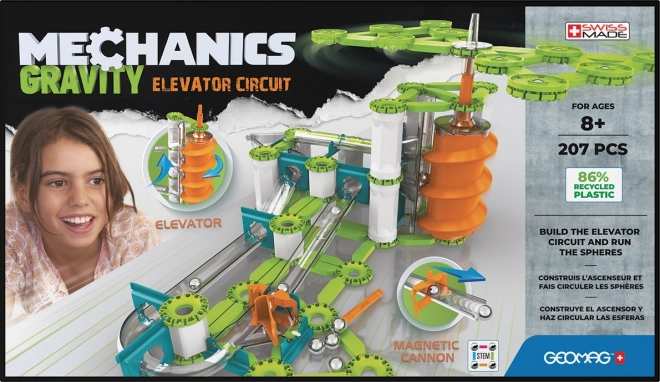 Geomag Mechanics Gravity je sestavljanka, ki združuje magnetizem z mehaniko ter spodbuja ustvarjalnost in iznajdljivost. Vsebuje magnetne palčke, kovinske kroglice in mehanske elemente iz recikliranih materialov.