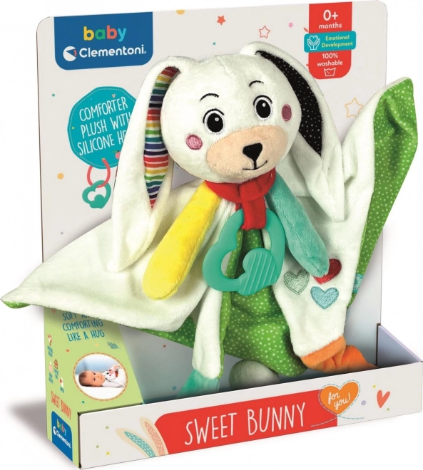 Sladki zajček BABY CLEMENTONI je nežen, varen in idealen za crkljanje ter mirno uspavanje. Hipoalergenski material zadrži znane vonjave, ki dojenčka pomirijo in mu vlivajo občutek varnosti. Vgrajeni silikonski grizalnik lajša izrast zobkov in nudi dodatne senzorične dražljaje.