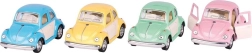 Zaradi kompaktnih mer 10 × 5,5 × 5,5 cm je avtomobilček idealen sopotnik na poti. Dovolj je, da ga nekajkrat potegnete nazaj, in hrošč se požene naprej – preprosta in priljubljena zabava, ki ne zamori.