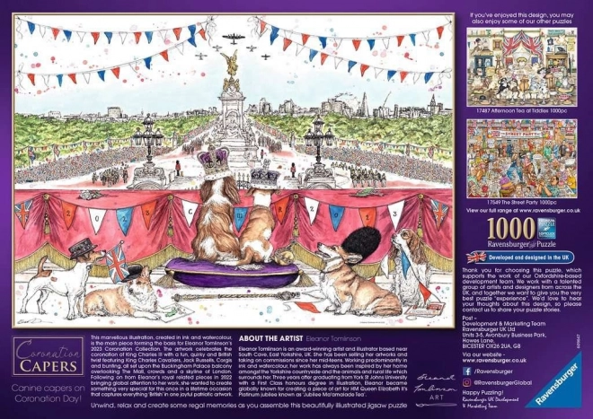 Osupljiva sestavljanka "Coronation Capers" prinaša edinstveno priložnost doživeti britansko kraljevo tradicijo v udobju doma. Delo umetnice Eleanor Tomlinson je bogato z detajli in ponuja pogled na King Charles španjele, Jack Russell terierje, korgije in druge elemente, povezane s kronanjem.