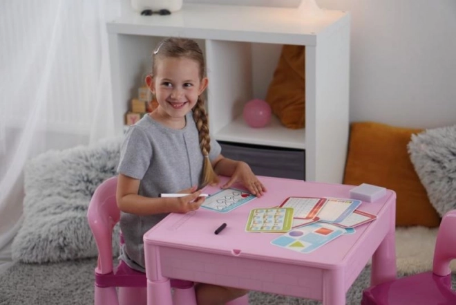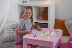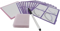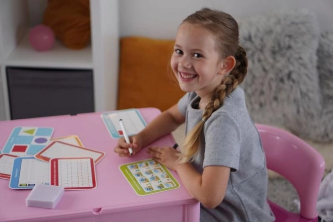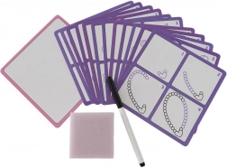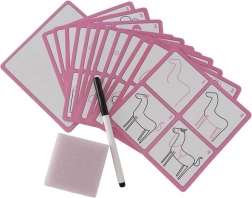Komplet je zasnovan za večkratno uporabo: posebni flomaster lahko preprosto obrišete s priloženo gobico, zato lahko otroci vadijo tako dolgo, kot želijo. Idealno za vajo doma, na poti in kot smiseln dar.