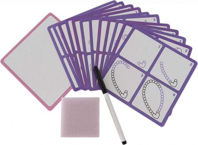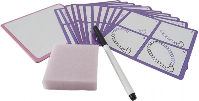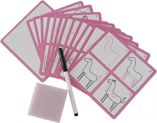 Zabaven in praktičen komplet za male umetnike spodbuja spretnost, zbranost in potrpežljivost. Vsebuje 12 večkrat uporabnih kartic, posebni izbrisljiv flomaster in gobico za enostavno brisanje, zato lahko otrok risanje vadi znova in znova.