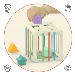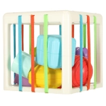 Ta elastična kocka je zasnovana tako, da pomaga razviti celoten spekter otroških spretnosti. Poleg tradicionalnega vstavljanja in izvleke oblikovanih blokov v in iz kocke, ponujamo inovativen dizajn z gumijastimi trakovi, ki dodajajo nov element težavnosti in zabave.