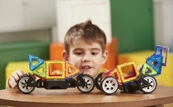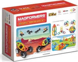 Uživaj v zabavi s Transform Wheel Bugy podjetja Magformers. Kreativni magnetni konstruktor omogoča sestavljanje velikega števila tridimenzionalnih objektov s pomočjo dvodimenzionalnih plastičnih mnogokotnikov. Magformers vadi fino motoriko, spodbuja ustvarjalnost, uči otroke barve in osnovne geometrijske oblike. Dimenzije delov in premišljeno izbrani oblikovni elementi zagotavljajo največjo možno varnost igrače. Material, iz katerega je komplet izdelan, izpolnjuje najstrožja higienska in zdravstvena merila. Deli so dovolj veliki, ni jih mogoče pogoltniti in so praktično nezlomljivi. Vsebina pakiranja: 8 trikotnikov 6 kvadratov 1 pravokotnik 15x plastični dodatki 2 kolesi – 1x poseben podvoz. Eden od posebnih podvozij je opremljen z masivnimi kolesi, ki jih je mogoče neodvisno vrteti do 90°, zato jih lahko uporabite za modeliranje eno- in dvoslednih vozil. Drugo podvozje je klasična os z 2 povezanima kolesoma, pri kateri je možno nastaviti 3 različne višinske položaje priključne plošče, kar pride prav pri različno drznih karoserijah štirikolesnikov in buggyjev. V kombinaciji s katerimikoli drugimi deli Magformers se pestrost in velikost vozil večkratno povečata. Večina izmed stotin avtomobilov in motorjev, zgrajenih iz tega kompleta, je presenetljivo vzdržljivih, zato jih je mogoče brez skrbi uporabljati tudi kot funkcionalne igrače. Primerno za otroke od 3 let.