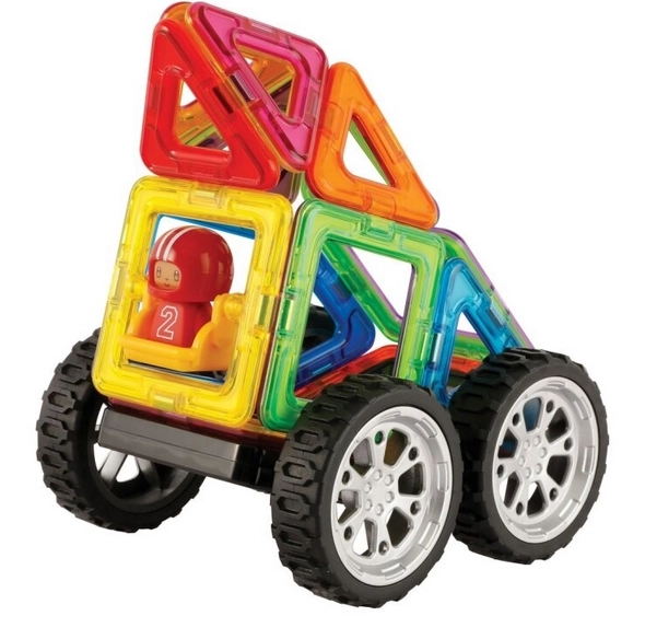 Presenetljivo veliko možnosti iz razmeroma malo kosov. Sestavi 30 različnih avtomobilov. Glavna prednost tega kompleta je 8 dvostranskih predlog iz trpežnega kredastega papirja z zaobljenimi robovi. Del pakiranja je slikovni priročnik, ki vsebuje predloge za 30 različnih avtomobilov. Idealno za otroke od 3 do 6 let za spoznavanje didaktičnih lastnosti gradnikov Magformers in kot pokušina tega, kaj je mogoče ustvariti tudi iz razmeroma majhnega števila kosov. Plakati z mrežami in navodili za gradnjo so veliki, deli so prikazani v dejanski velikosti, tako lahko otroci začnejo graditi z zelo nazorno metodo polaganja pravih delov neposredno na predloge. Število kosov: 18 kosov + slikovni priročnik + 19 dvostranskih predlog: 5 kvadratov 8 trikotnikov 1 kvadrat z gugalnico 2 kolesi 1 figurica 1 rezervna čelada Kreativna magnetna sestavljanka Magformers omogoča sestavljanje velikega števila tridimenzionalnih objektov s pomočjo dvodimenzionalnih plastičnih mnogokotnikov. Magformers razvija fino motoriko, spodbuja ustvarjalnost, uči otroke barv in osnovnih geometrijskih oblik. Dimenzije delov in skrbno izbrane oblike zagotavljajo največjo možno varnost igrače. Material, iz katerega je sestavljanka izdelana, izpolnjuje najstrožja higienska in zdravstvena merila. Deli so dovolj veliki, da jih ni mogoče pogoltniti, in so praktično nelomljivi. MAGFORMERS je mogoče zelo dobro kombinirati tudi z znano magnetno sestavljanko Geomag.