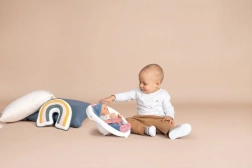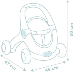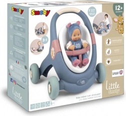 Robustna zasnova s 4 širokimi kolesi in zvezno nastavljivo zavoro zagotavlja stabilnost in varnost pri prvih korakih. Del kompleta je mehka punčka Little Smoby (30 cm) – obraz iz kakovostne plastike, mehko tekstilno telesce – idealna za objemanje, uspavanje in vsakodnevno nego.