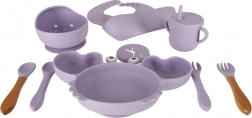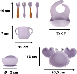 Ta vsestranski komplet olajša vsak obrok – krožnik v obliki raka s predelki poskrbi za pregledne porcije, skodelica z vakuumskim priseskom preprečuje prevrnitve, lonček z dvema ročajema pa spodbuja samostojno pitje. Slinček z globokim žepom ujame drobtine in polivanja, zato je pospravljanje po jedi hitrejše.