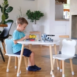 Ta sodoben lesen komplet v brezčasni kombinaciji bele barve in naravnega lesa se lepo poda v vsako otroško sobico ali igralnico. Zaobljene linije in igriv videz z medvedjimi ušeski spodbujajo otroško domišljijo, medtem ko robustni materiali zagotavljajo dolgo življenjsko dobo in enostavno čiščenje.