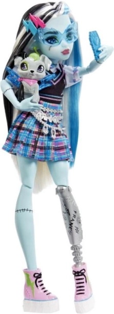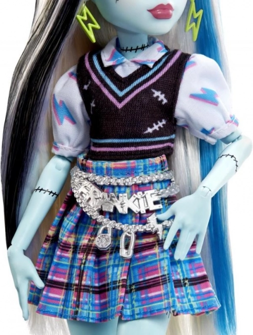 Frankie Stein je pripravljena zasijati po šolskih hodnikih z edinstvenim videzom. Njena obleka vključuje stilsko karirasto krilo, bluzo z motivom strel in kamizolko, dopolnjeno s platform čevlji in drugimi dodatki, kot so očala in uhani v obliki strel.