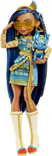 Punčka Cleo De Nile iz kolekcije Monster High zablesti v ikoničnem outfitu, navdihnjenem s starim Egiptom: modro‑zlata obleka z rokavi, ki spominjajo na povoje, dopolnjena z verižnim pasom in visokimi škornji do kolen. Celoten videz poudarjajo zlat nakit in stajliš sončna očala.