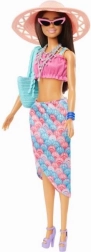 Punčka Barbie ima preproste rjave lase in je oblečena v rožnat enodelni kopalni kostum z vzorcem zebre.