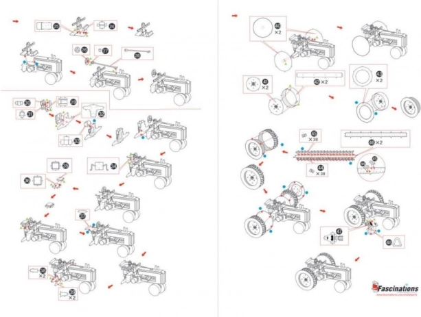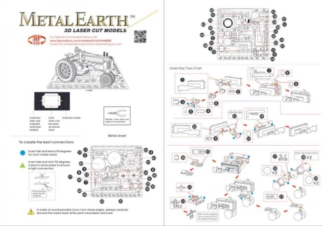 Posamezne dele iztisnite iz kovinskih plošč; po potrebi uporabite majhne ščipalne klešče (niso priložene). Delci se med seboj povezujejo z zaklepi, ki jih tvorita zatič in odprtina. Zatič upognite s pomočjo majhnih ozkih klešč (niso priložene) ter postopoma povežite vse zaklepe, dokler ne nastane zelo realističen mojstrski izdelek!