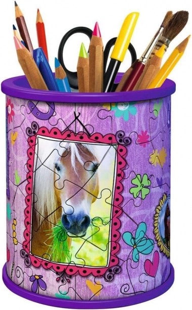 Stilsko in praktično stojalo za pisala v obliki 3D sestavljanke z motivom konja znamke RAVENSBURGER. Deli iz trdne plastike se natančno prilegajo brez lepljenja, zato nastane stabilen lonček za svinčnike ali organizator za drobnarije. Sestavljate lahko po motivih ali številkah na zadnji strani – idealno darilo za otroke in ljubitelje konj.