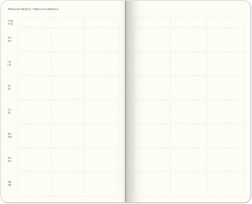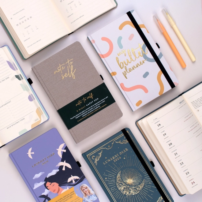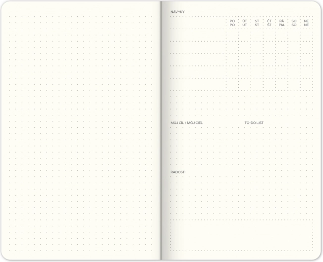Z nedatirano postavitvijo lahko začnete kadarkoli v letu ter povezujete sledenje navadam, to‑do sezname in cilje v enem priročnem zvezku. Kompaktni format 13 × 21 cm se prilega tako v torbico kot nahrbtnik ter je idealen za potovanja, šolo ali službo.